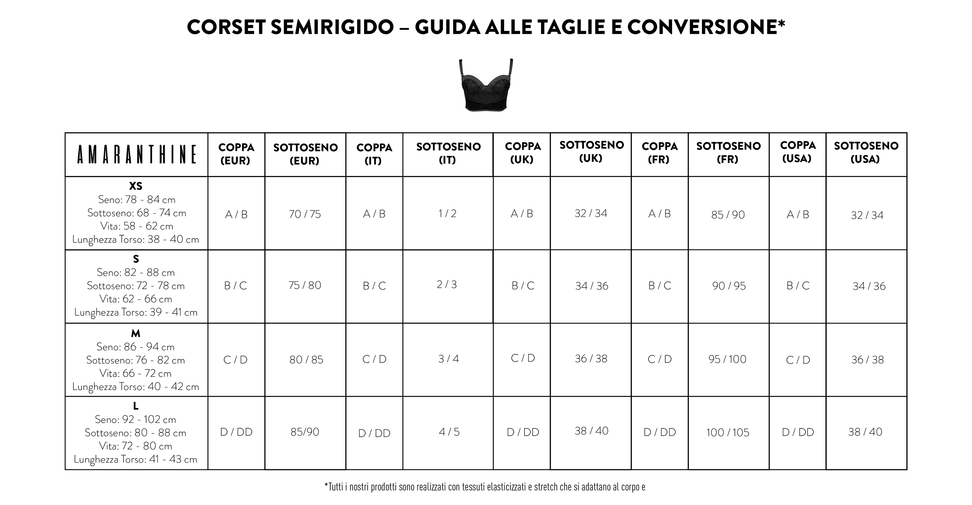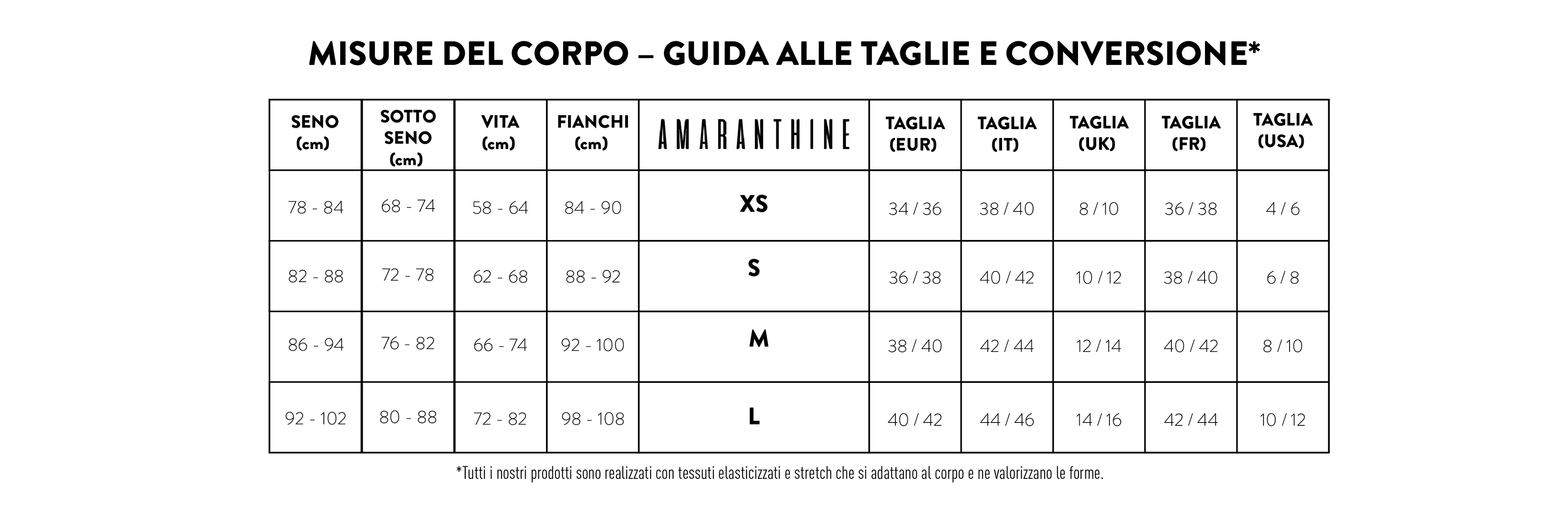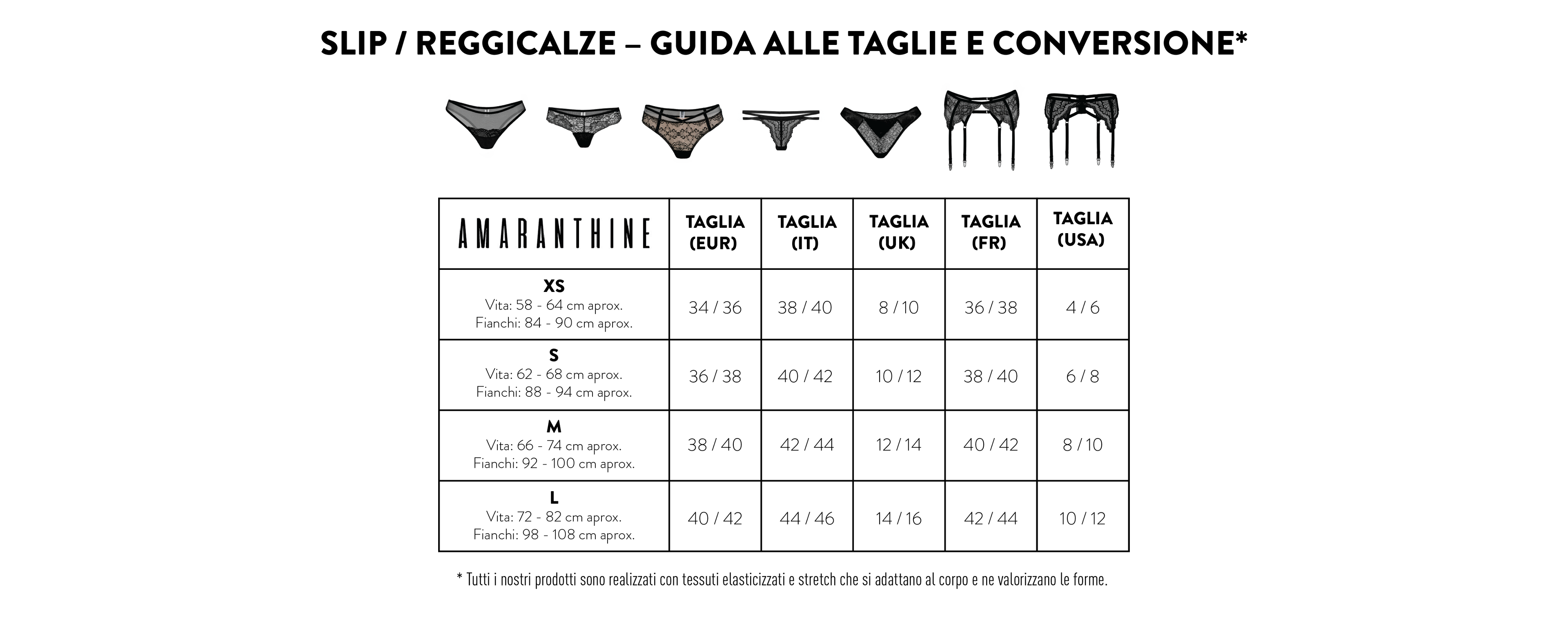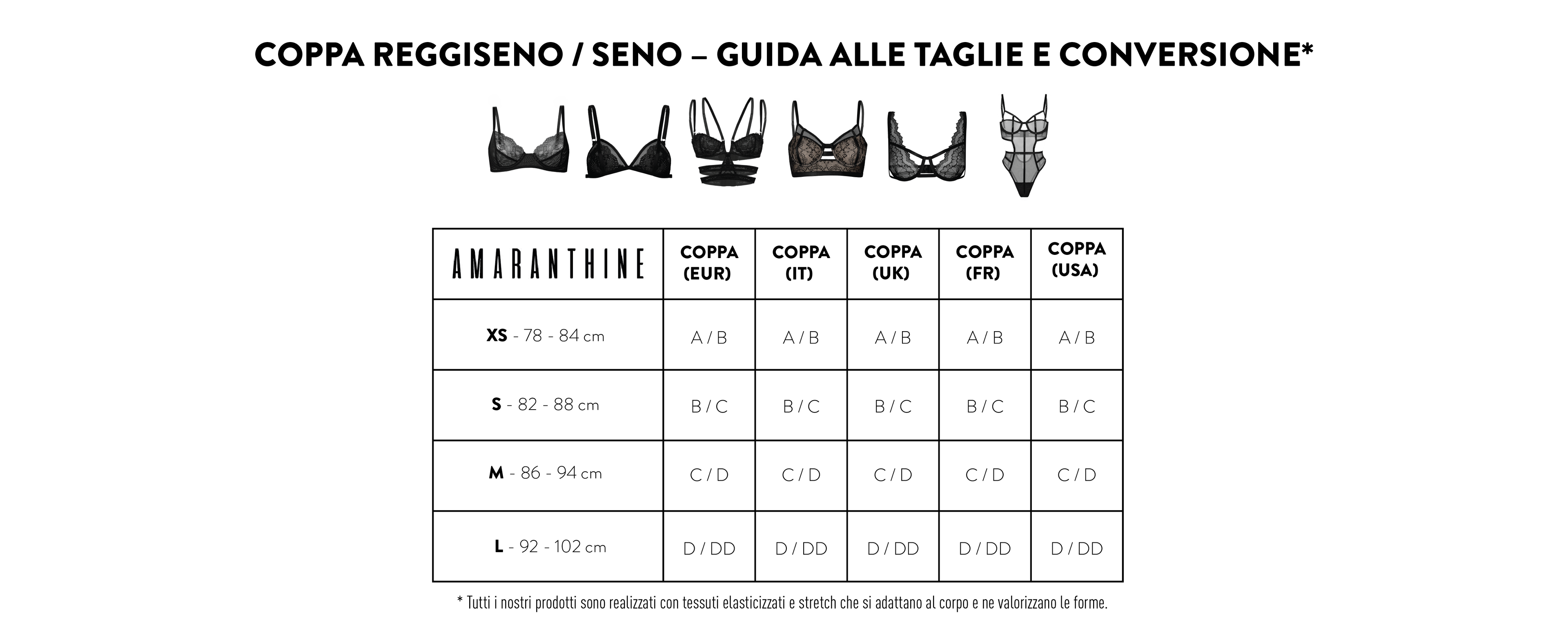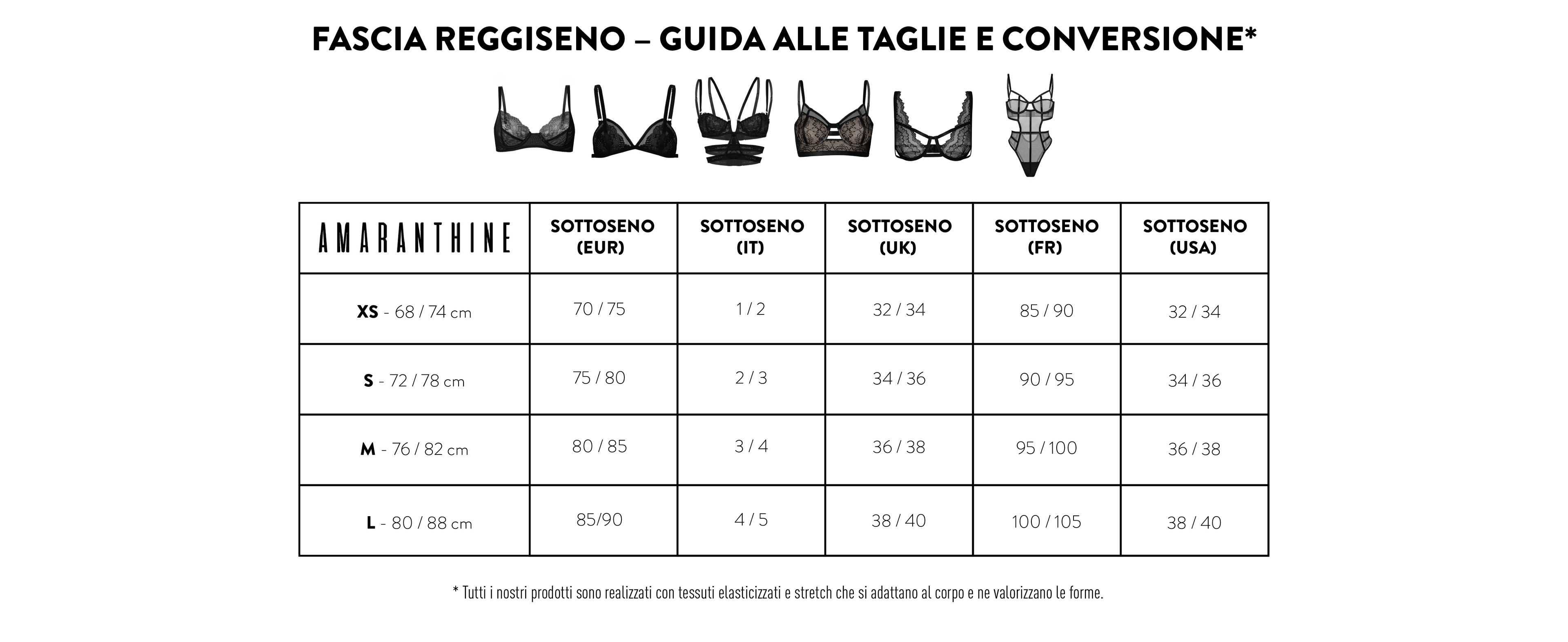 Vogliamo che la nostra lingerie ti vesta alla perfezione, per questo forniamo informazioni dettagliate sulle taglie, tabelle di conversione internazionali e indicazioni su come misurarti correttamente, così da trovare la misura e la vestibilità più adatte al tuo corpo unico.