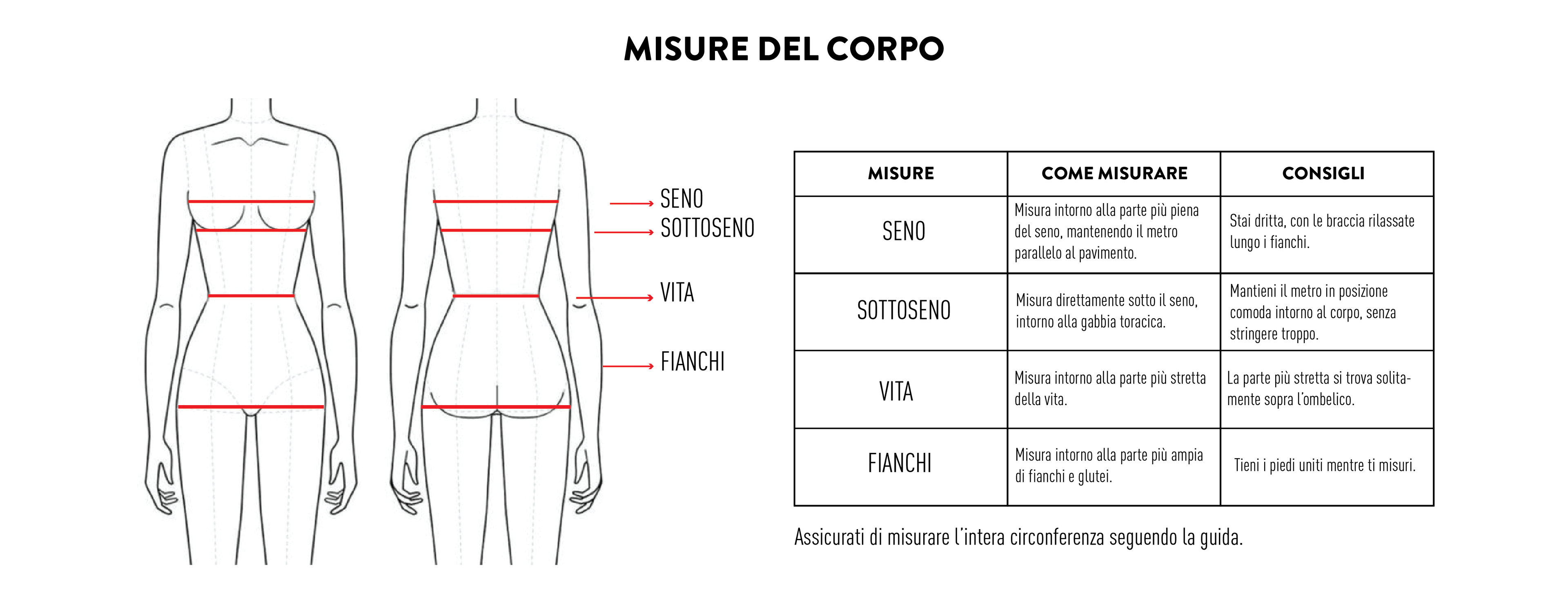 Consapevoli che ogni corpo è diverso, ti invitiamo a contattarci per qualsiasi dubbio sulla taglia prima di procedere all’acquisto. Il nostro team è a tua disposizione per aiutarti a trovare la vestibilità perfetta per la tua silhouette.