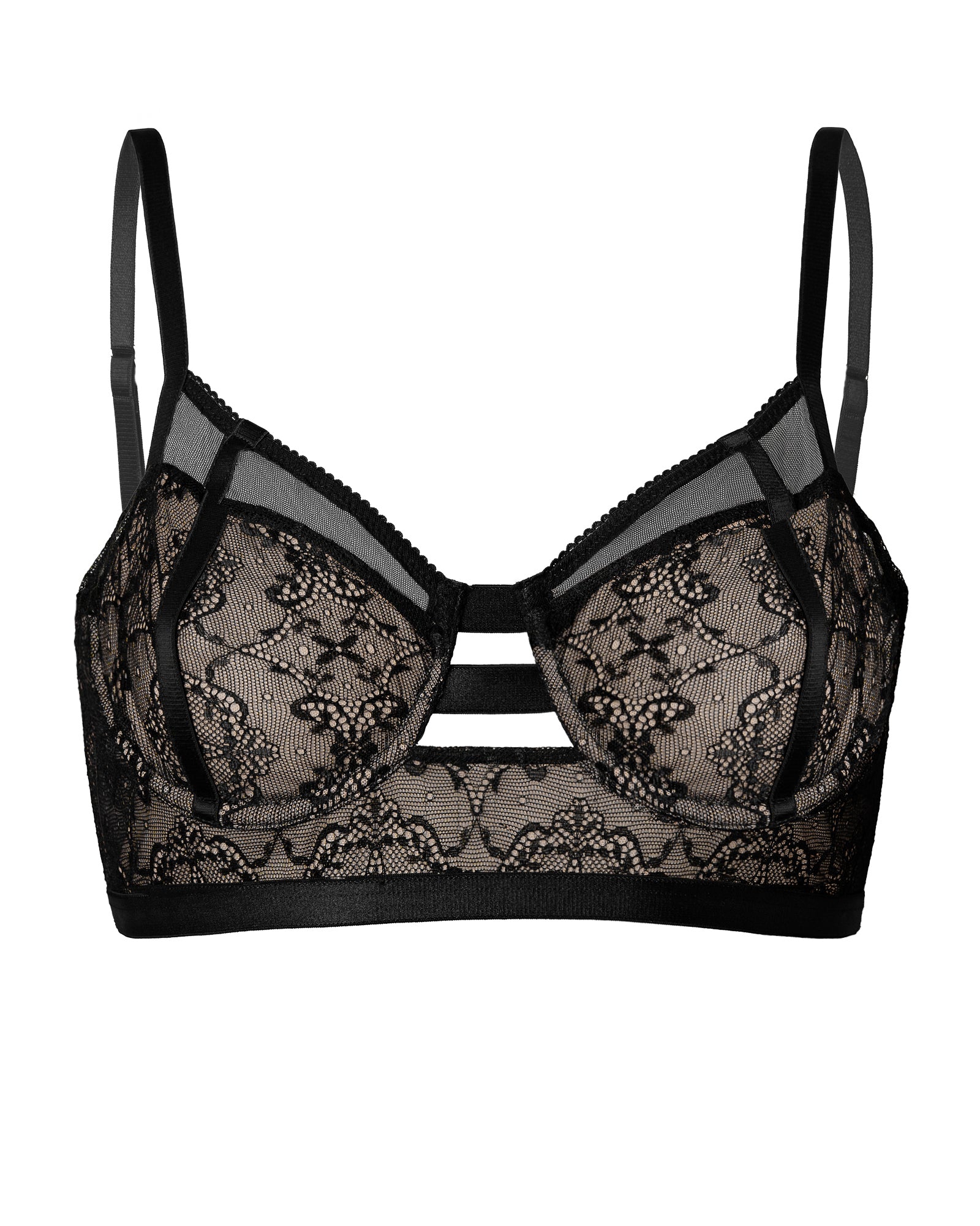 The Tita Bra blends graphic lines with delicate femininity. Crafted in Italy from sheer embroidered lace and soft tulle, it features underwired cups for light support and natural shape. The distinctive double elastic bands across the front create a bold, contemporary silhouette, while elastic trims and adjustable straps ensure a perfect, comfortable fit.